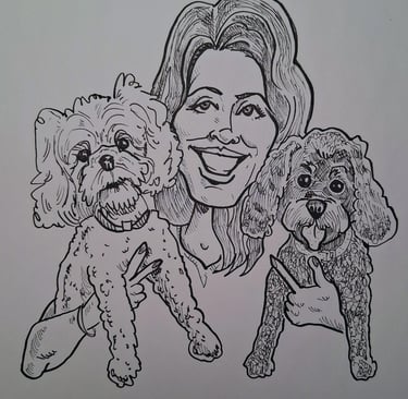 Send me your photos and I’ll craft charming black-and-white or color cartoons. I also do pet caricatures!